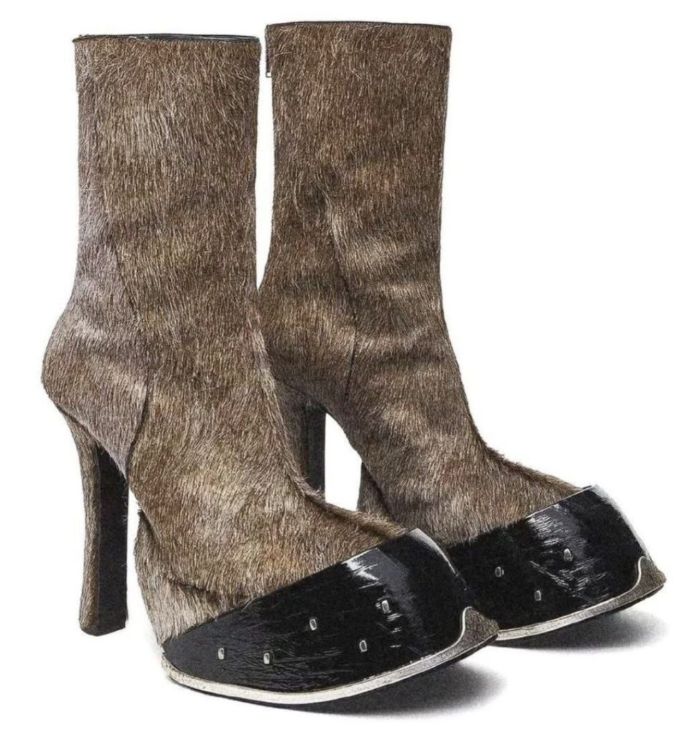 بوتهای جدید مککوئین با نام «Hoof Boots»، طراحی جسورانهای دارند که به شکل سم حیوانات ساخته شدهاند. این بوتها با استفاده از موهای طبیعی گاو و جزئیات فلزی مانند میخهای نقرهای و کفی شبیه به سم، ظاهری منحصر به فرد و جذاب دارند. طراحی این بوتها به گونهای است که برخی از کاربران آن را به سم الاغ یا شخصیت «شنک» در انیمیشن «شرک» تشبیه کردهاند.