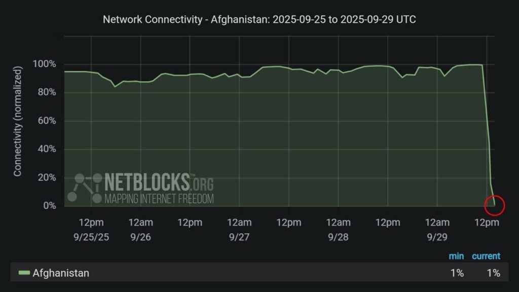 بر اساس گزارشهای معتبر، میزان دسترسی به اینترنت از حدود ۹۵ درصد به کمتر از یک درصد کاهش یافته است. تمامی شبکههای فیبر نوری، موبایل و خدمات اینترنتی از دسترس خارج شدهاند. این امر باعث توقف کامل دسترسی به شبکههای اجتماعی، وبسایتها و سرویسهای آنلاین در افغانستان شده است.