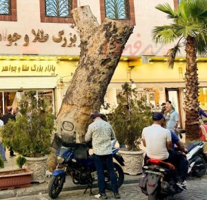 درخت تنومند واقع در بازار تهران و خیابان ۱۵ خرداد ناگهان بریده شد؛ علت هنوز مشخص نیست